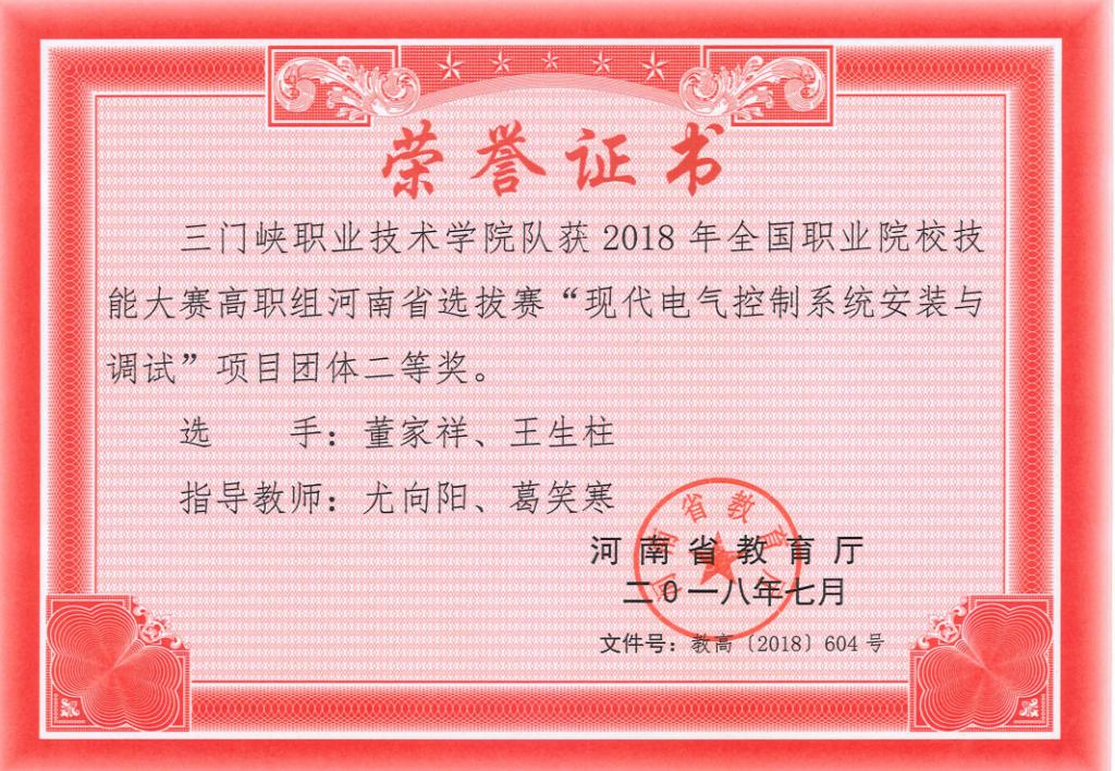 2018年河南省职业院校技能大赛“现代电气控制系统安装与调试”二等奖
