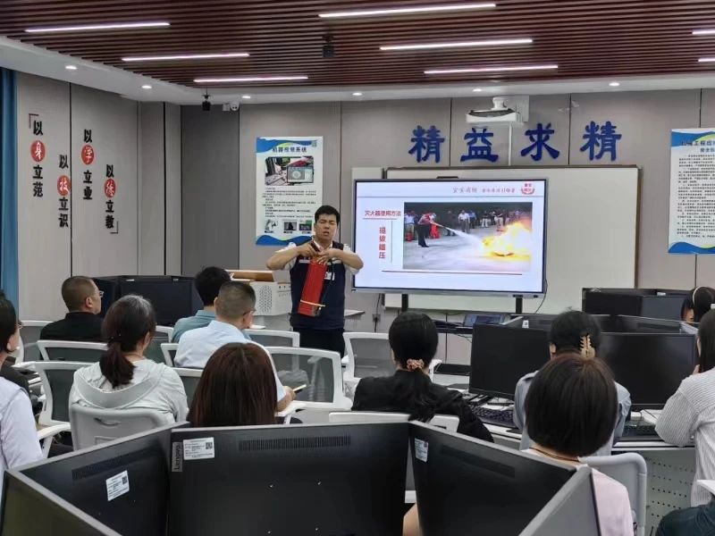 河南省宣安消防宣传中心焦国强教官,针对在生产生活中容易被忽视的潜在安全隐患,以深入浅出的方式详细介绍了常见火灾的发生原因、扑救初期火灾的方法以及预防火灾的具体措施等内容。通过典型案例讲授了应急疏散、消防安全法律法规等一系列防火安全知识,让师生们深刻了解到了火灾的危害性和相应预防措施,极大的增强了师生们的消防安全意识和火灾现场逃生自救能力。此外,还进行了实地操作演练,其中包括正确使用灭火器、消火栓等消防器材,与会人员按照动作要领轮番上阵,针对模拟的着火点进行灭火实操。