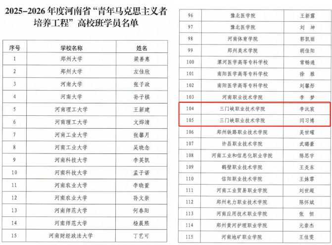 近日,共青团河南省委发布《关于开展2025-2026年度河南省“青年马克思主义者培养工程”高校班集中培训》的通知并公布本年度河南省“青年马克思主义者培养工程”高校班学员名单,我院2024级电气自动化运维二班李沅宸同学,经过资格审查、学校推荐、团省委综合评审等选拔程序,最终成功入选。