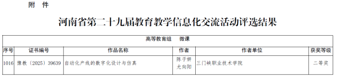 本届活动由河南省教育厅主办,以“推进教育数字化战略行动,提升教师数字素养与技能”为主题,聚焦信息技术与教育教学深度融合。经过专家严格评审,陈子妍、尤向阳老师的《自动化产线的数字化设计与仿真》作品荣获二等奖,充分展现了我院教师扎实的信息化教学功底与创新能力。