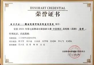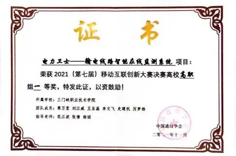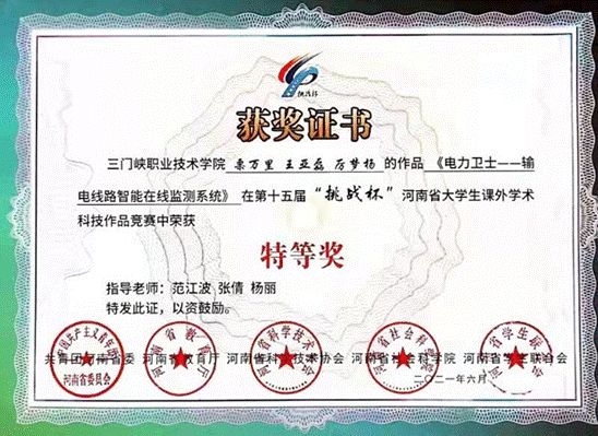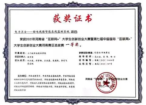 2021年栗万里团队携项目《电力卫士——输电线路智能在线监测系统》,通过校赛、省赛,一路过关斩将,最终晋级全国移动互联创新大赛国赛,获得“第七届移动互联网创新大赛中原赛区高校组(高职)金奖”、河南省“互联网+”大学生创新创业大赛一等奖。