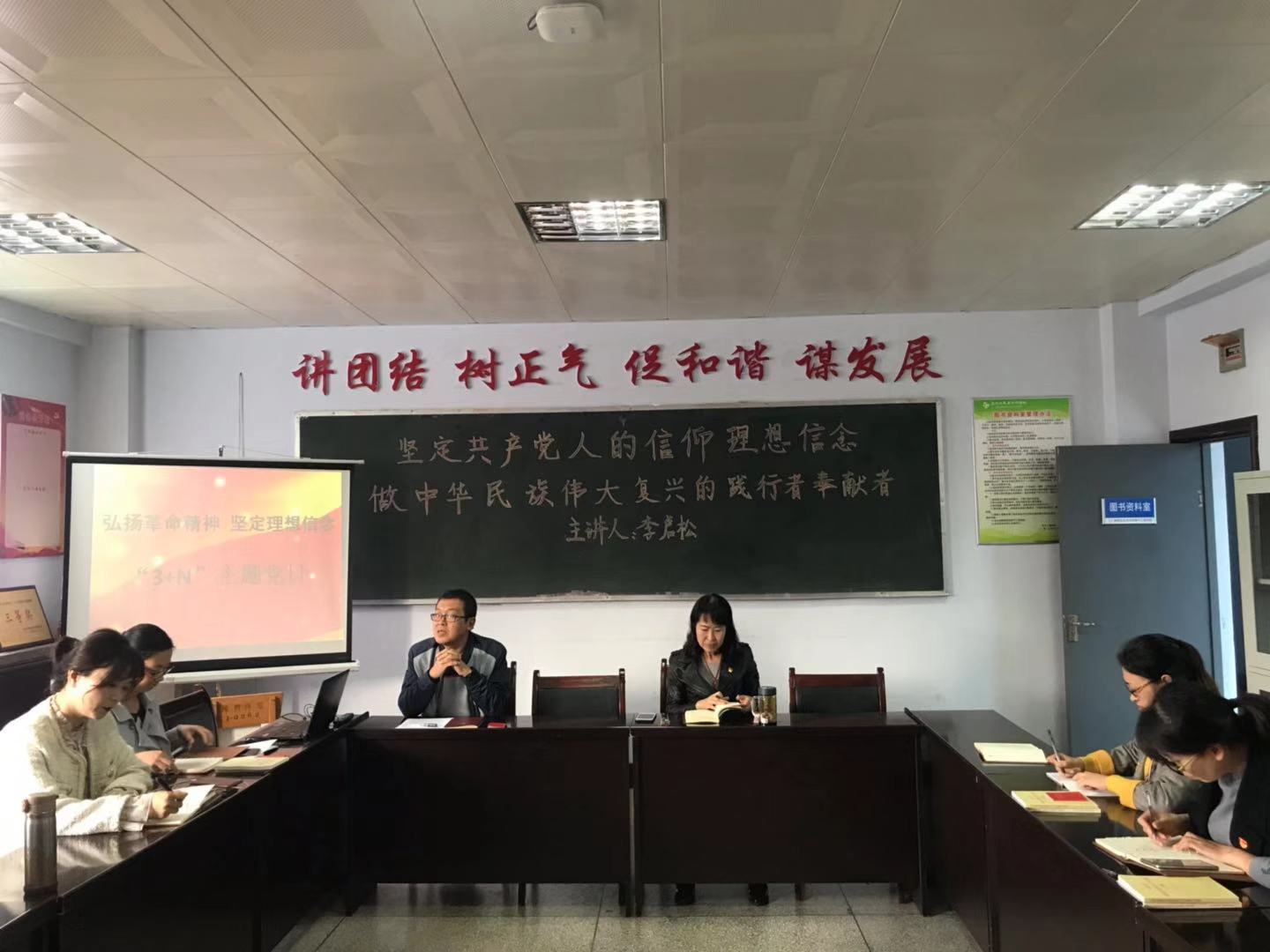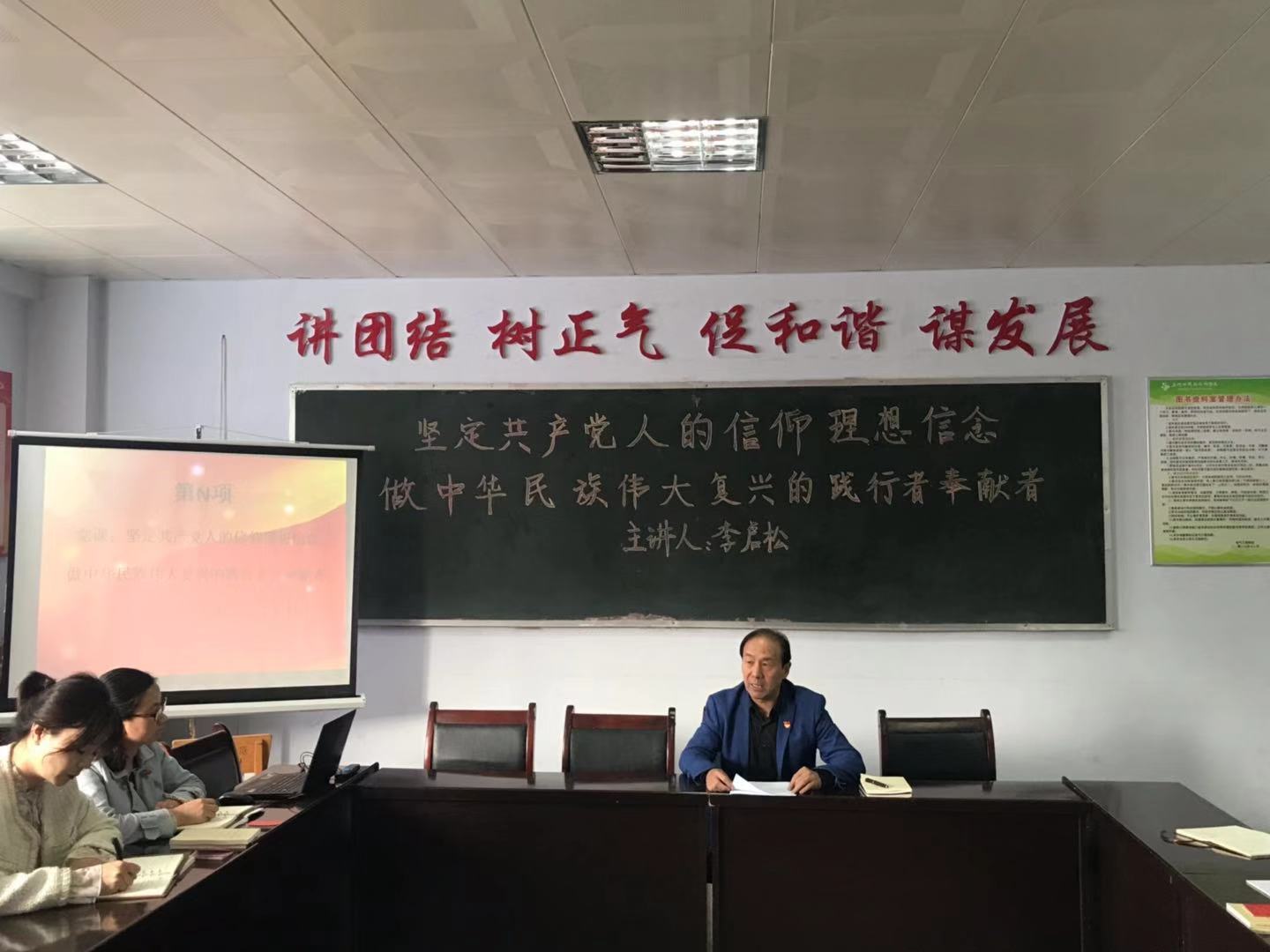 最后是领导寄语,总支书记刘国梅同志代表上级党组织讲话,刘书记再次强调坚定理想信念,坚守共产党人的精神追求,始终是共产党人安身立命的根本。我们全体党员同志要时刻对照党章要求、对照入党誓词,扪心自问是否还在坚守阵地,是否认同所有中国共产党的理念,特别是习近平新时代中国特色社会主义思想这一行动指南。刘书记要求全体党员在今后的工作中要学会理论指导实践,学会用习近平新时代中国特色社会主义思想指导教育和教学工作。