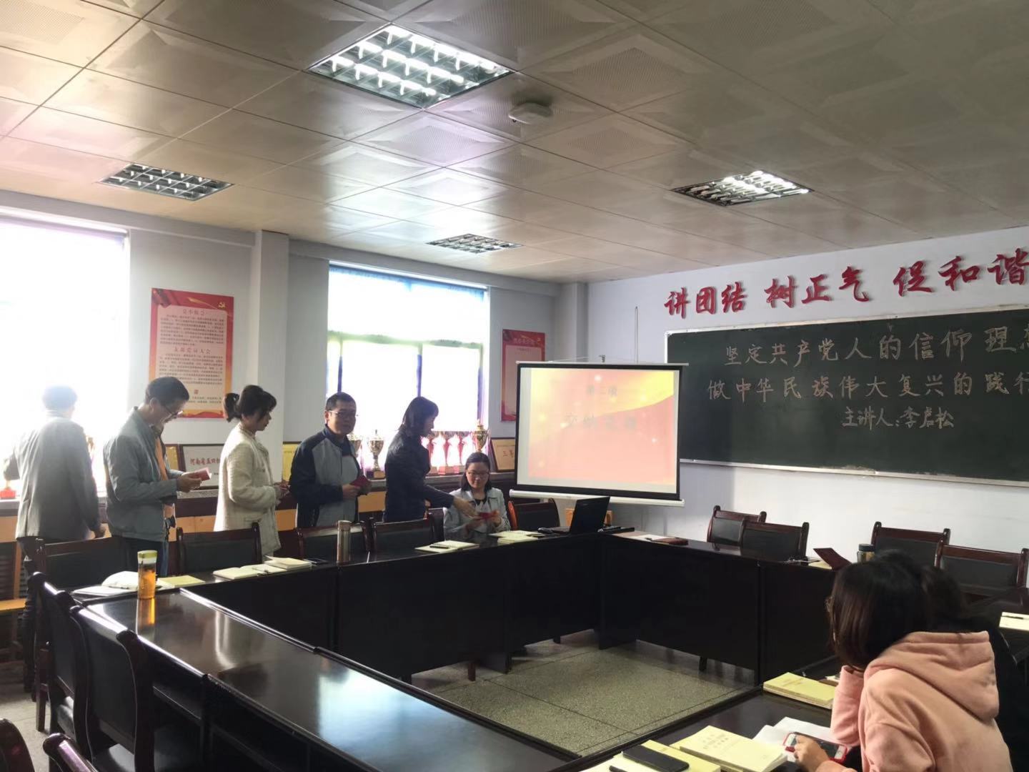 按照中央“不忘初心、牢记使命”主题教育工作精神及《中共三门峡职业技术学院委员会关于开展“不忘初心、牢记使命”“3+N”主题党日活动的通知》要求,3044永利教工党支部于10月12日在3409党员活动室开展“不忘初心、牢记使命”“3+N”主题党日活动,本次活动由教工党支部书记霍海波主持,教工支部全体党员参加了此次活动,包含以下几项内容:重温入党誓词,交纳本月党费,诵读经典,党课学习以及领导寄语。