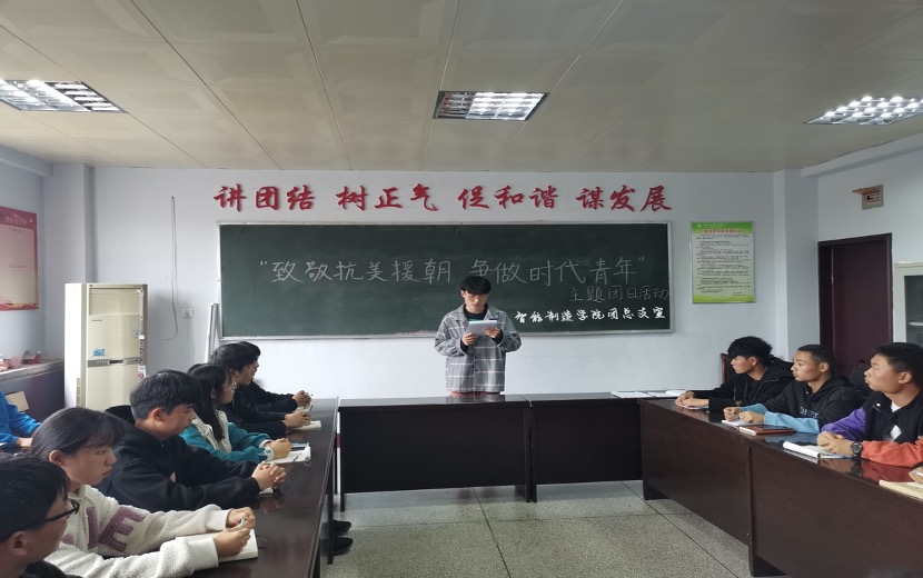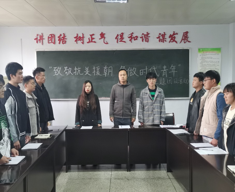 本次团日活动的主题是“致敬抗美援朝 争做时代新人”,包括三个部分。第一部分是召开团员座谈会,学习习近平总书记在纪念中国人民志愿军抗美援朝出国作战70周年大会上的讲话。同学们重温入团誓词,齐声高唱中华人民共和国国歌《义勇军进行曲》和中国共青团团歌《光荣啊,共青团》。座谈会上,同学们表示作为新时代的大学生,要追思过去、铭记历史,从历史和革命先辈的事迹中汲取精神养料,发挥专业优势勇挑信息时代重担。