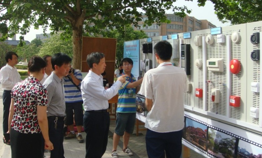 领导在观看学生设计的智能楼宇产品