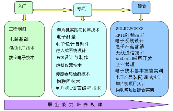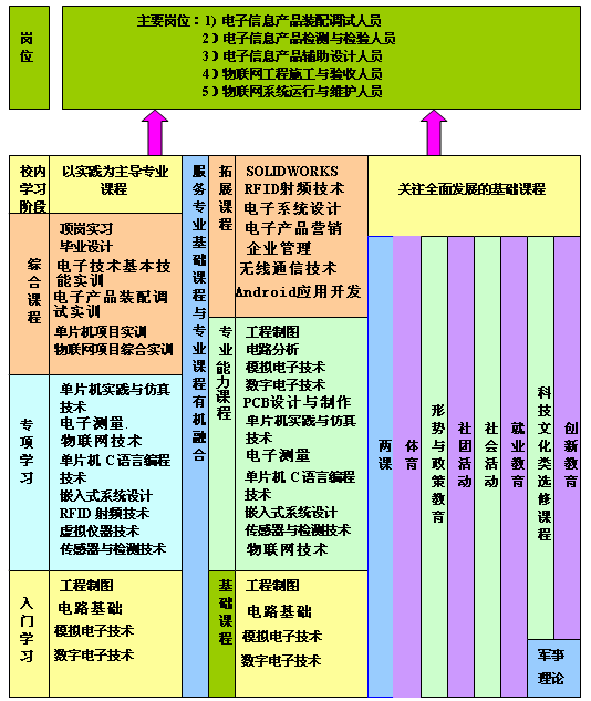 培养学生以下能力:1.能进行物联网电子线路的测试、设计; 2.能进行物联网硬件和传感装置的安装、调试; 3.能进行物联网系统升级改造; 4.能进行物联网产品的生产制造与设备维护和简单故障诊断排除能力; 5.无线组网安装测试能力 |