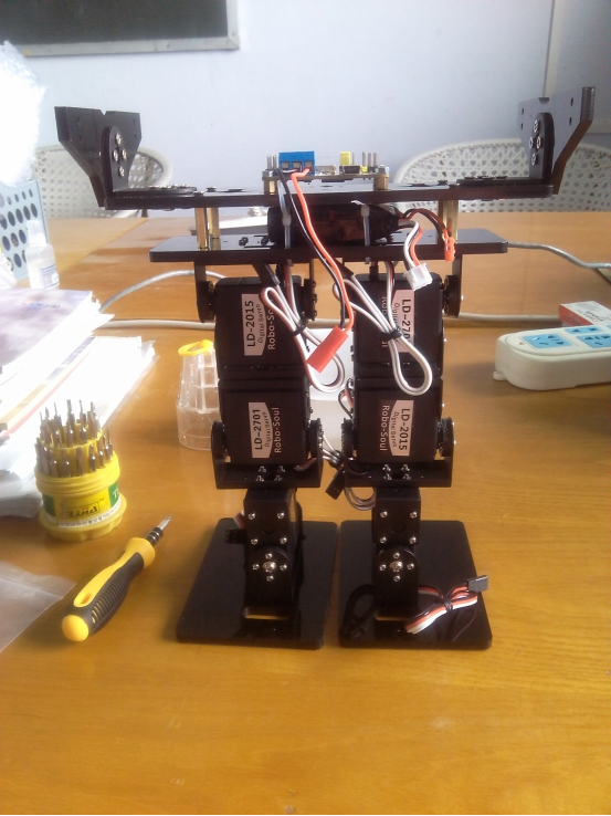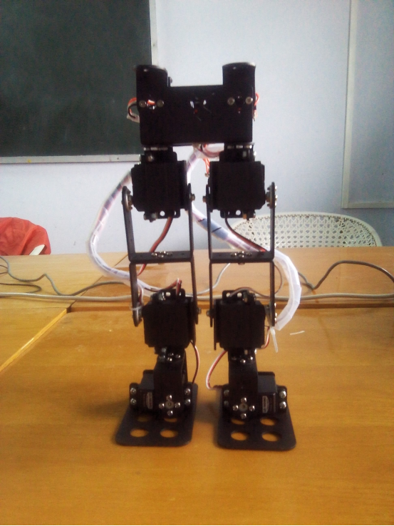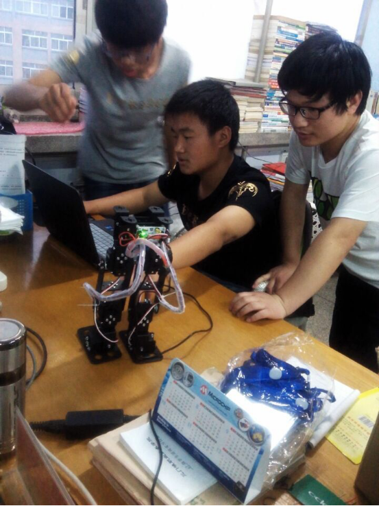 硬件制作第一步是要按照设计好的图样选择零部件。于是他们就深入市场一个个挑,一个个找,一个个对比选择。为了突出机器人造型和质感,大家选择了一些金属零件。有了材料,还需要将齿轮、螺丝、零件等大大小小的零部件按照图纸装配在一起,成为完整的机器人。但在装配过程中出现了一些没有预料到的事。譬如,由于结构体的刚度不够,受力后就发生较大扭曲;舵机的扭矩不够,根本就带不动完整的机器人;无法精确加工材料,铰接处晃动厉害等等。致使设计方案一改再改,最终成型的机器人,上身很短,两腿占据身体大部分,全身“膝盖”、“大腿”、“脚腕”等部位共用了6个舵机进行控制。而机械腿的连接是通过一些连接件来完成,包括机械腿、机械足、机械滑轮、机械支点、舵机等。在机械腿的控制上,采用一只脚固定,另一支脚由舵机控制,实现机械腿的行走和转向,以完成金鸡独立和翻跟头等动作。为了确保机器人行走、翻滚、倒退的可靠性,选用了大扭力的舵机。