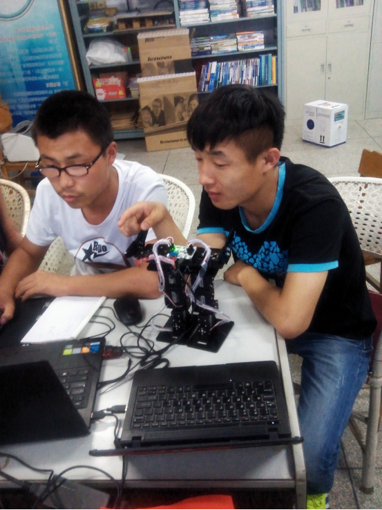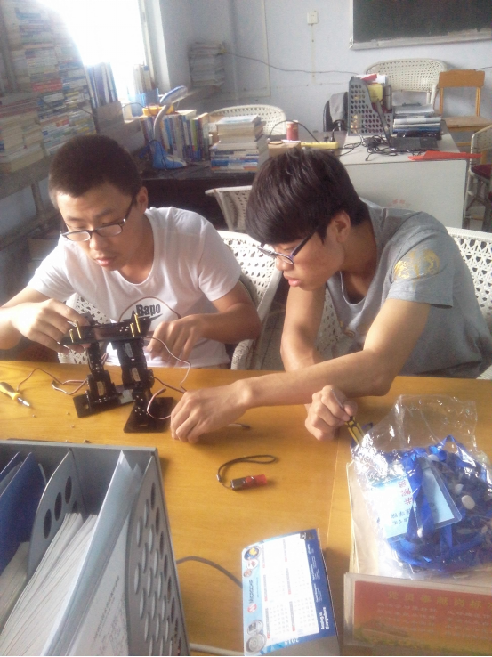 就在创意大赛进入倒计时的时候,一次调试发现第二组同学的机器人左腿的一个舵机不会动了,这可急坏了14电信的小伙子们,眼看大赛迫在眉睫,机器人不能按照设定的动作跳舞,怎么办?组长靳振宇说,拆下来再仔细查查。于是大家就把出问题的舵机拆下来了,拧开螺丝打开舵机外壳,漏出舵机内的电路板,他们笑了。原来舵机电源线“-”极那根线断了。调试成功后,当看到俩机器人兄弟按照自己设计的动作跳起舞来的时候,同学们激动地欢呼,接着紧紧地相拥在一起,内心的喜悦无以言表,8名同学中唯一的女生甚至激动地掉下了眼泪。