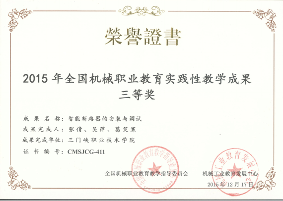 2015全国机械职业教育实践性教学成果奖获奖证书2